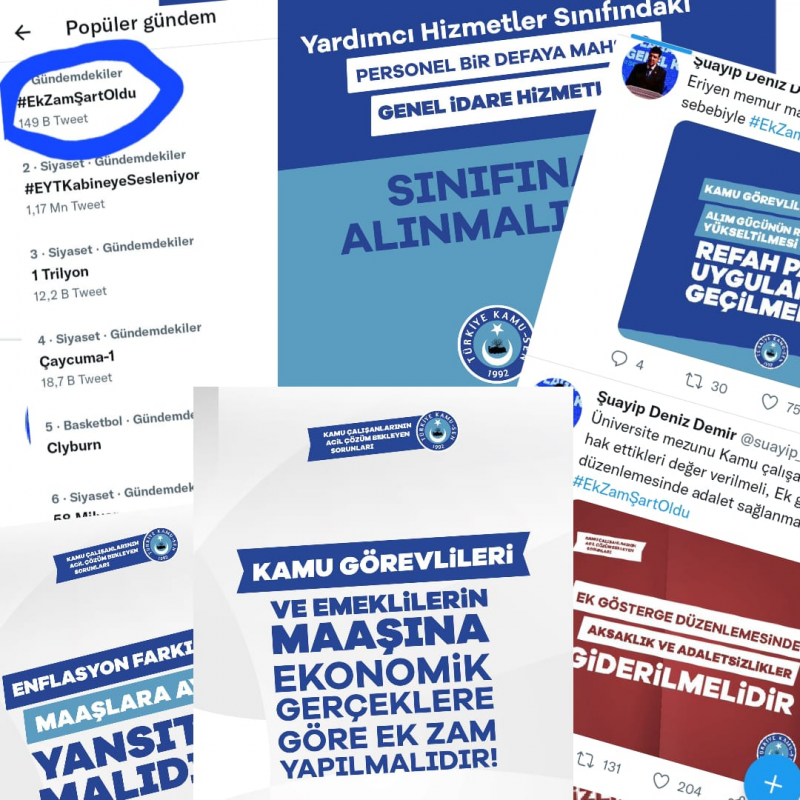 Genel Başkanımız Önder Kahveci’nin ilk tweete #EkZamŞartOldu etiketiyle ile başlayan çalışmamız, kısa sürede atılan yüz binlerce tweet ile Trend Topic (TT) listesine girerek Türkiye gündeminde birinci sıraya yükselirken, Tagımız Twitter’ın Dünya Gündeminde de ilk sıraya çıkarak uzun süre zirvedeki yerini korudu.