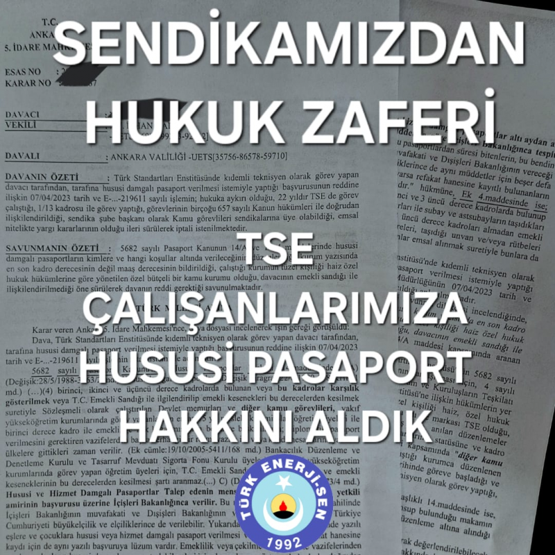 TSE çalışanlarına yıllardır verilmeyen “Hususi Pasaport” hakkı Sendikamızın sürdürdüğü hukuk mücadelesi neticesinde, mahkeme kararıyla nihayete ermiştir.